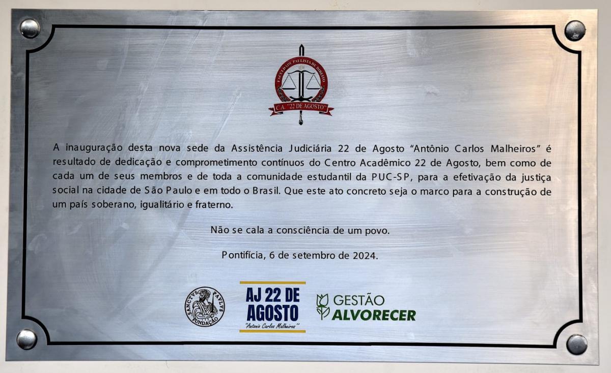 Na manhã de 6/9, foi inaugurada a nova sede da Assistência Judiciária (AJ) 22 de Agosto “Antônio Carlos Malheiros”, do Centro Acadêmico 22 de Agosto (Direito), agora situada na Rua da Consolação, 881.