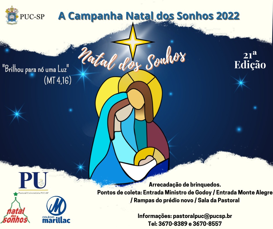 A Campanha Natal dos Sonhos, iniciativa da Arquidiocese de São Paulo realizada pela Pastoral do Menor em parceria com vários colégios católicos, entre eles a PUC-SP e o colégio Marillac, iniciou a arrecadação de brinquedos de 2022. O objetivo é arrecadar doações durante o período que antecede o Natal, para que sejam doados às instituições que atendem crianças menos favorecidas e em situação de risco.