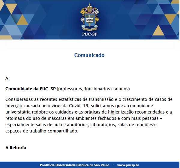 Leia, a seguir, o comunicado da Reitoria sobre uso de máscaras, enviado a toda a comunidade por e-mail: