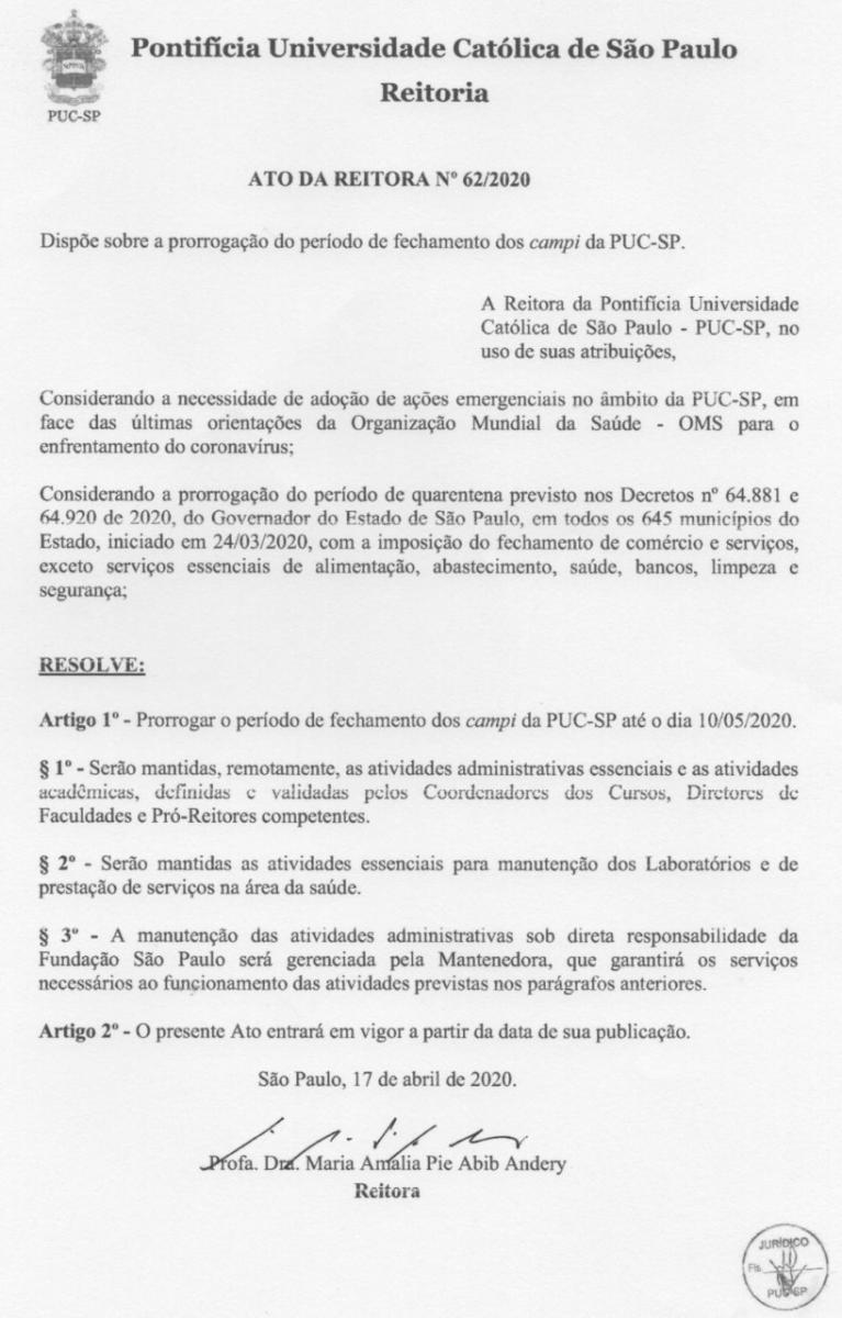 A PUC-SP prorrogou a suspensão das atividades presenciais da Universidade até dia 10/05/2020. A medida atende a determinação do governo e das autoridades sanitárias do estado de São Paulo, que decidiram pela manutenção das medidas de afastamento social até a mesma data.