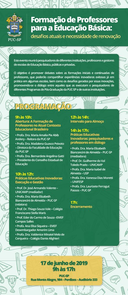 A Pró-Reitoria de Graduação da PUC-SP realiza, dia 17/6, no campus Monte Alegre, o evento Formação de Professores para a Educação Básica: desafios atuais e necessidade de renovação.