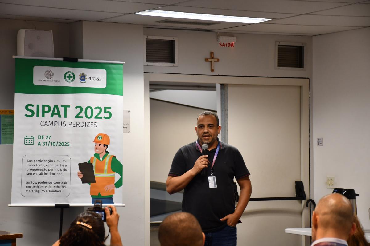 A Pontifícia Universidade Católica de São Paulo deu início, na segunda-feira passada (27/10) à Sipat 2025 – Semana Interna de Prevenção de Acidentes de Trabalho, no Campus Monte Alegre. A cerimônia de abertura ocorreu no auditório 100 do Edifício Reitor Bandeira de Melo e contou com a presença de colaboradores da Universidade, da equipe da Cipa 2025 (Comissão Interna de Prevenção de Acidentes) e da Gerência de Desenvolvimento Humano da Fundação São Paulo (FUNDASP).