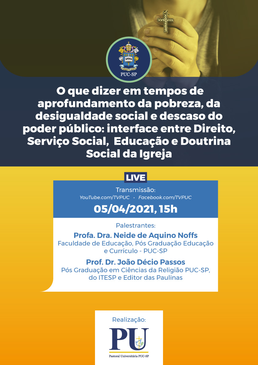 A Pastoral Universitária realiza, dias 23/3 e 5/4, às 15h, o evento O que dizer em tempos de aprofundamento da pobreza, da desigualdade social e descaso do poder público: interface entre Direito, Serviço Social, Educação e Doutrina Social da Igreja.