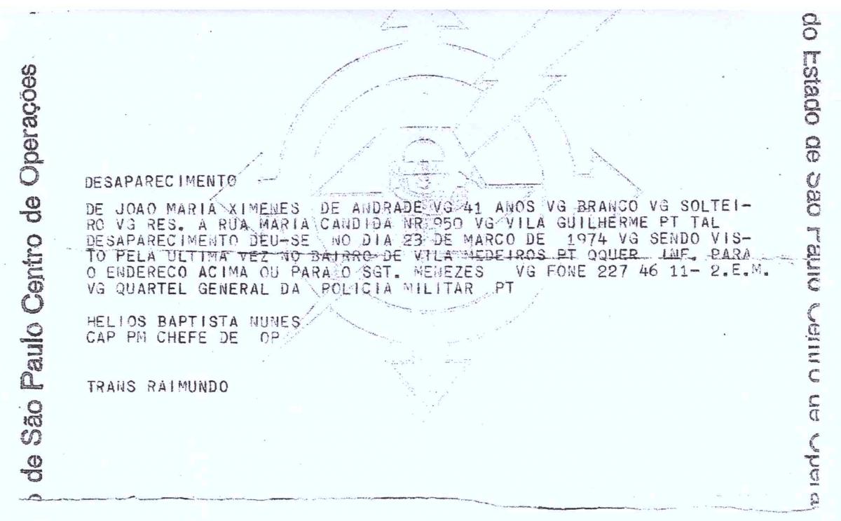A Comissão da Verdade da PUC-SP Reitora Nadir Gouvêa Kfouri encontra fortes indícios sobre o desaparecimento de mais um ex-aluno durante a ditadura militar. Familiares de João Maria Ximenes de Andrade, que cursava Ciências Econômicas, procuraram a Universidade na tentativa de conseguir informações sobre o paradeiro do estudante, que teria sido sequestrado no bairro de Vila Medeiros, aos 41 anos, no dia 23 de março de 1974. O ano corresponde ao período (1974-1975) em que foram presos e sequestrados militantes do Partido Comunista Brasileiro (PCB), entre eles David Capistrano, Jose Roman, além de João Masena, Luiz Ignácio Maranhão, e outros desaparecidos.
