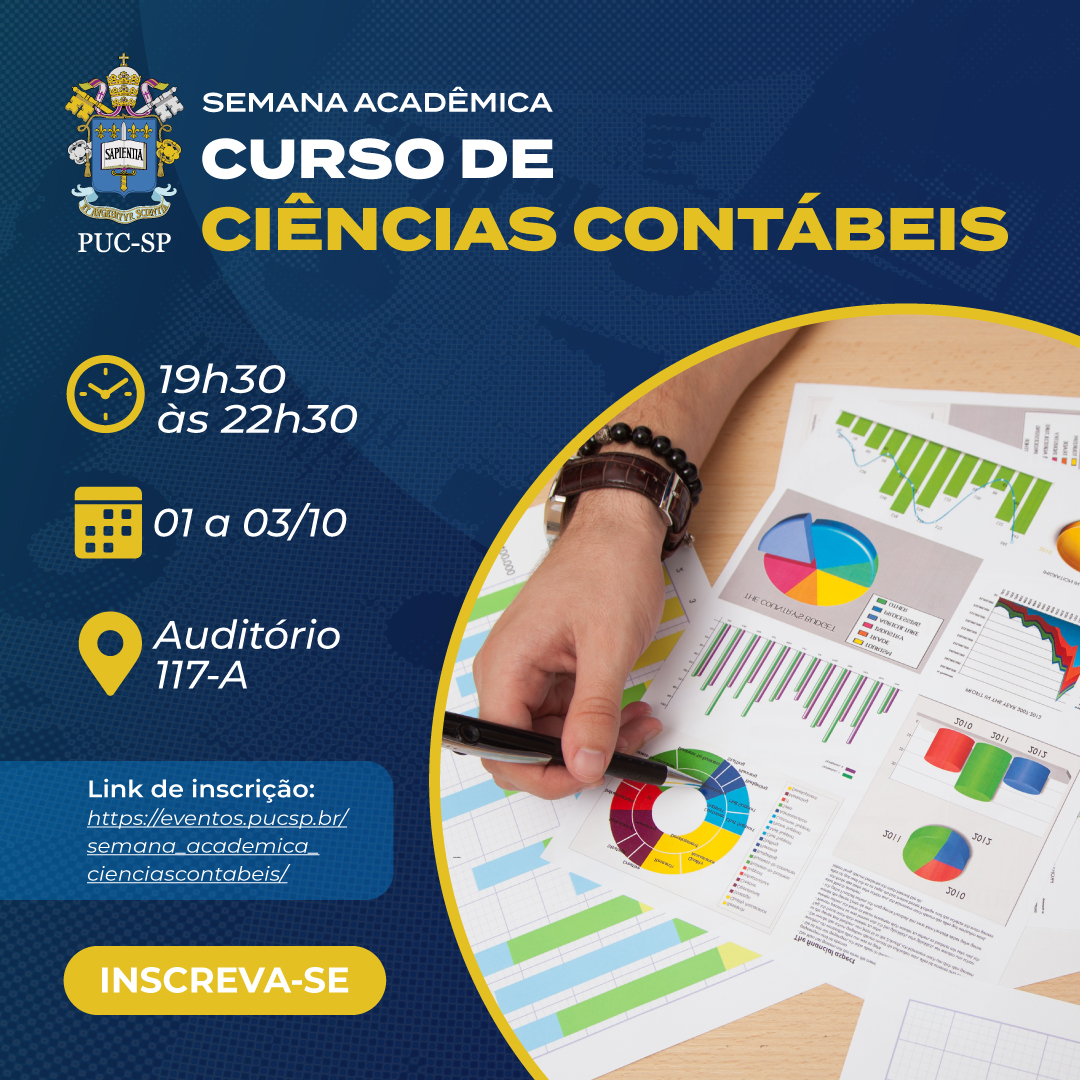 A Faculdade de Economia, Administração, Contábeis e Atuariais (FEA) promove a Semana Acadêmica do Curso de Ciências Contábeis. A atividade acontece de 1º a 3/10, das 19h30 às 22h30, no auditório 117A do campus Monte Alegre.
