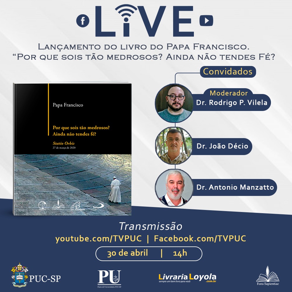 Dia 30/4, às 14h, será realizada uma live sobre o lançamento do livro do papa Francisco: Por que sois tão medrosos? Ainda não tendes fé?