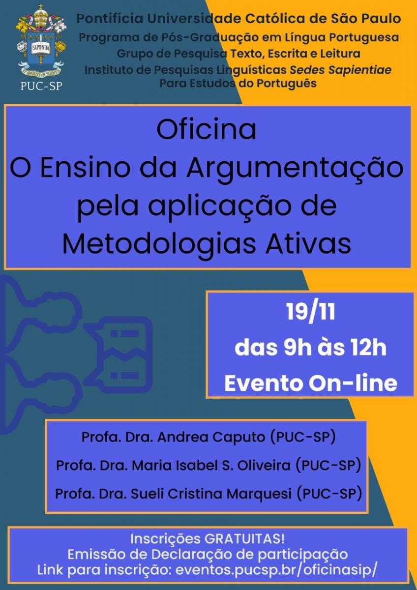 Na ocasião, será abordado o tema O ensino da argumentação pela aplicação de metodologias ativas, das 9 às 12h.