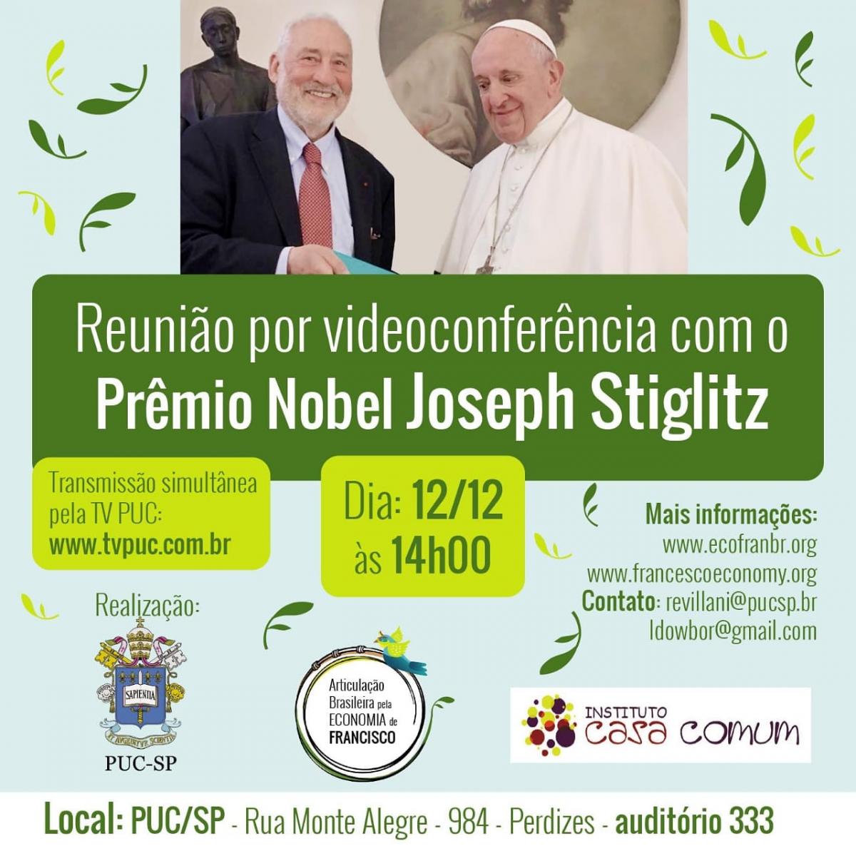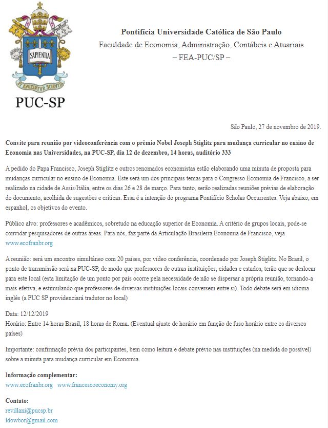 No dia 12/12, a partir das 14h, o Papa Francisco, Joseph Stiglitz e outros renomados economistas participam de uma reunião por videoconferência, que será retransmitida no Brasil, simultaneamente, na PUC-SP. Nesse encontro será elaborada uma minuta de proposta de mudança curricular no ensino de Economia. Este será o tema principal no Congresso Economia de Francisco que se realizará na Itália, em Assis, de 26 a 28 de março de 2020.
