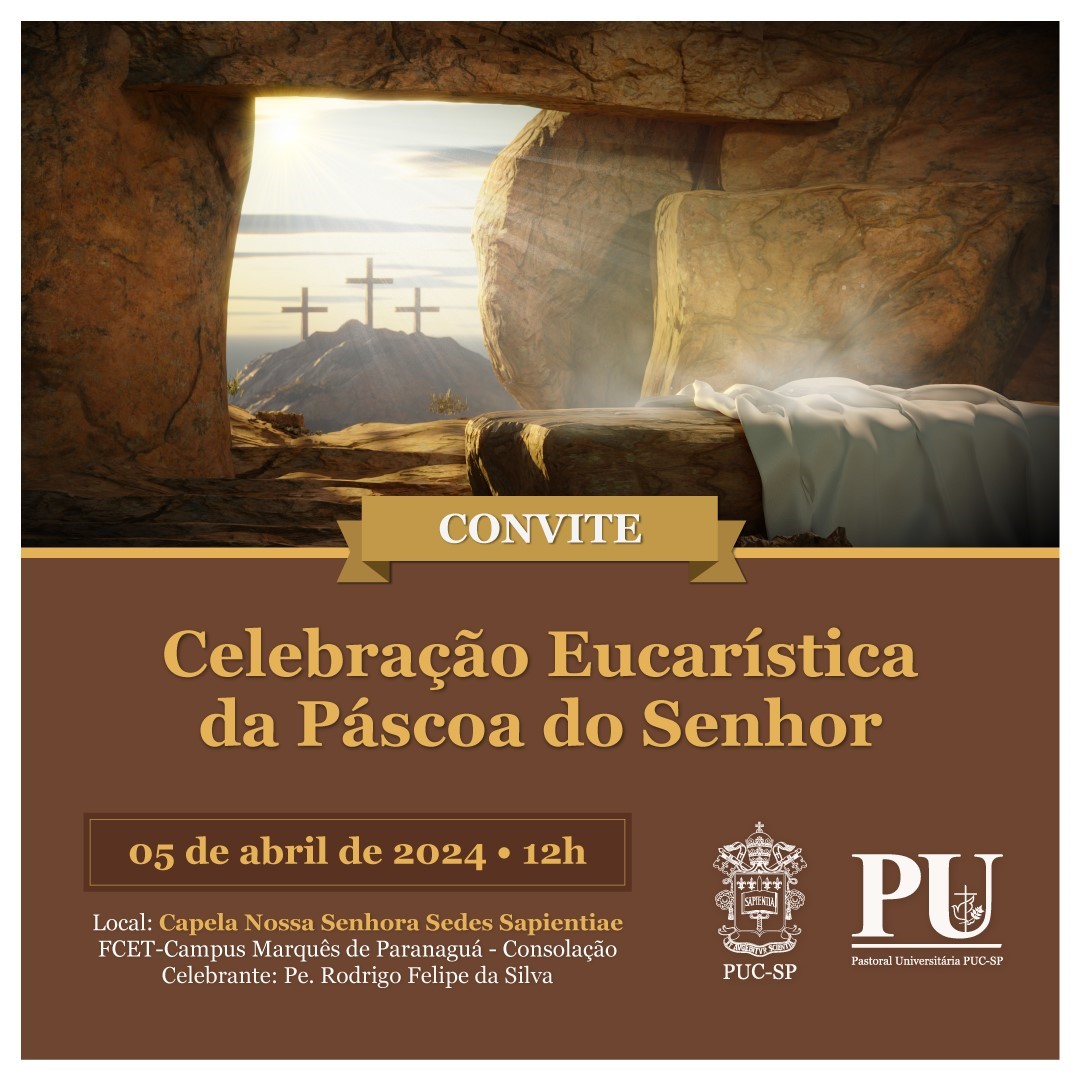 A Pastoral Universitária convida toda a comunidade acadêmica para a Celebração Eucarística de Páscoa no campus Marquês de Paranaguá. Atividade acontece no dia 5/4, às 12h, na capela Nossa Senhora Sedes Sapientiae.