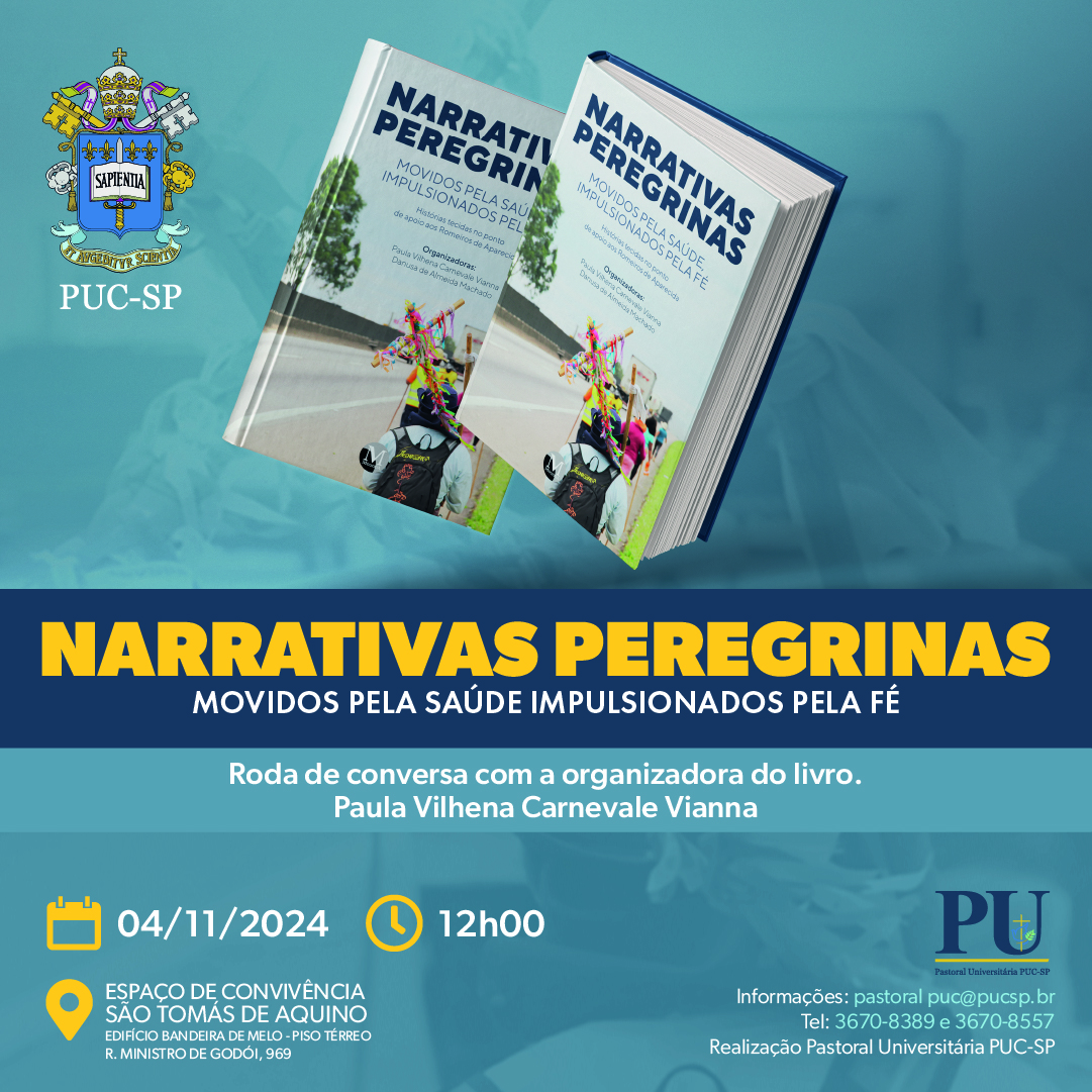A Pastoral Universitária da PUC-SP promove o lançamento do livro Narrativas Peregrinas: movidos pela saúde e impulionados pela fé. Atividade acontece no dia 4/11, às 12h, no espaço de convivência São Tomás de Aquino.