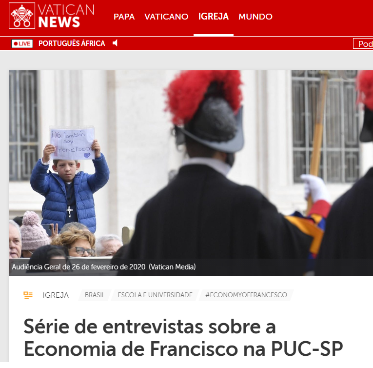 O Vatican News, portal de notícias do Vaticano, destaca em sua página principal a série de entrevistas promovida pelo Núcleo Fé e Cultura e pela Pastoral Universitária da PUC-SP sobre a Economia de Francisco, evento online convocado pelo Papa Francisco e organizado pelo Dicastério para o Serviço do Desenvolvimento Humano Integral, Diocese de Assis, que contou, em novembro de 2020, com a participação de economistas, empreendedores, pesquisadores, ativistas com menos de 35 anos por uma nova economia, que seja justa, inclusive e sustentável.