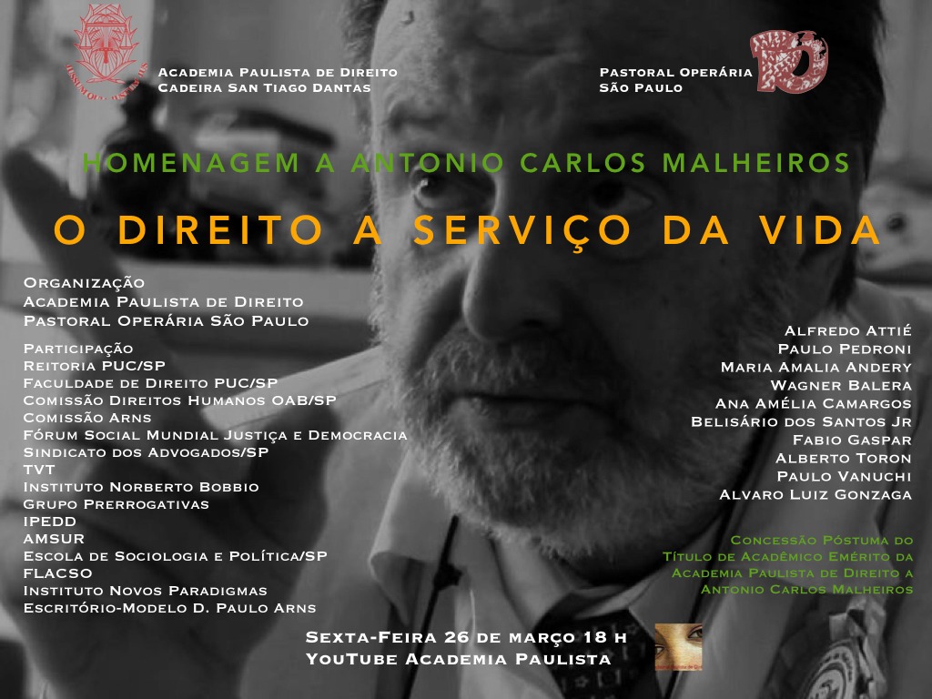 Já a Academia Paulista de Direito - Cadeira San Tiago Dantas e a Pastoral Operária São Paulo organizam, dia 26/3, às 18h, a Homenagem a Antonio Carlos Malheiros, o Direito a serviço da Vida.