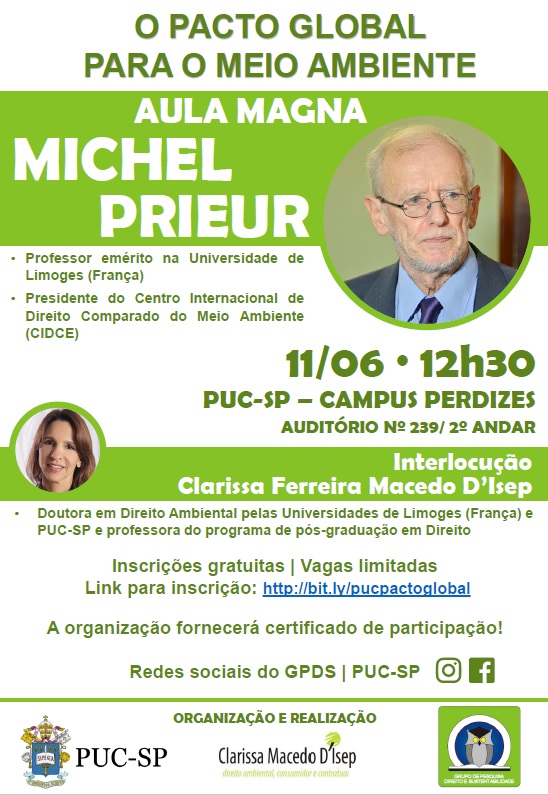 O professor Michel Prieur, da Universidade de Limoges, na França, realiza aula magna sobre Pacto Global para o Meio Ambiente, a convite da profa. Clarissa Ferreira Macedo D’Isep e do Grupo de Pesquisa Direito e Sustentabilidade (GPDS). Ele estará no campus Monte Alegre, dia 11/6, às 12h30, auditório 239 (2º andar, prédio novo).