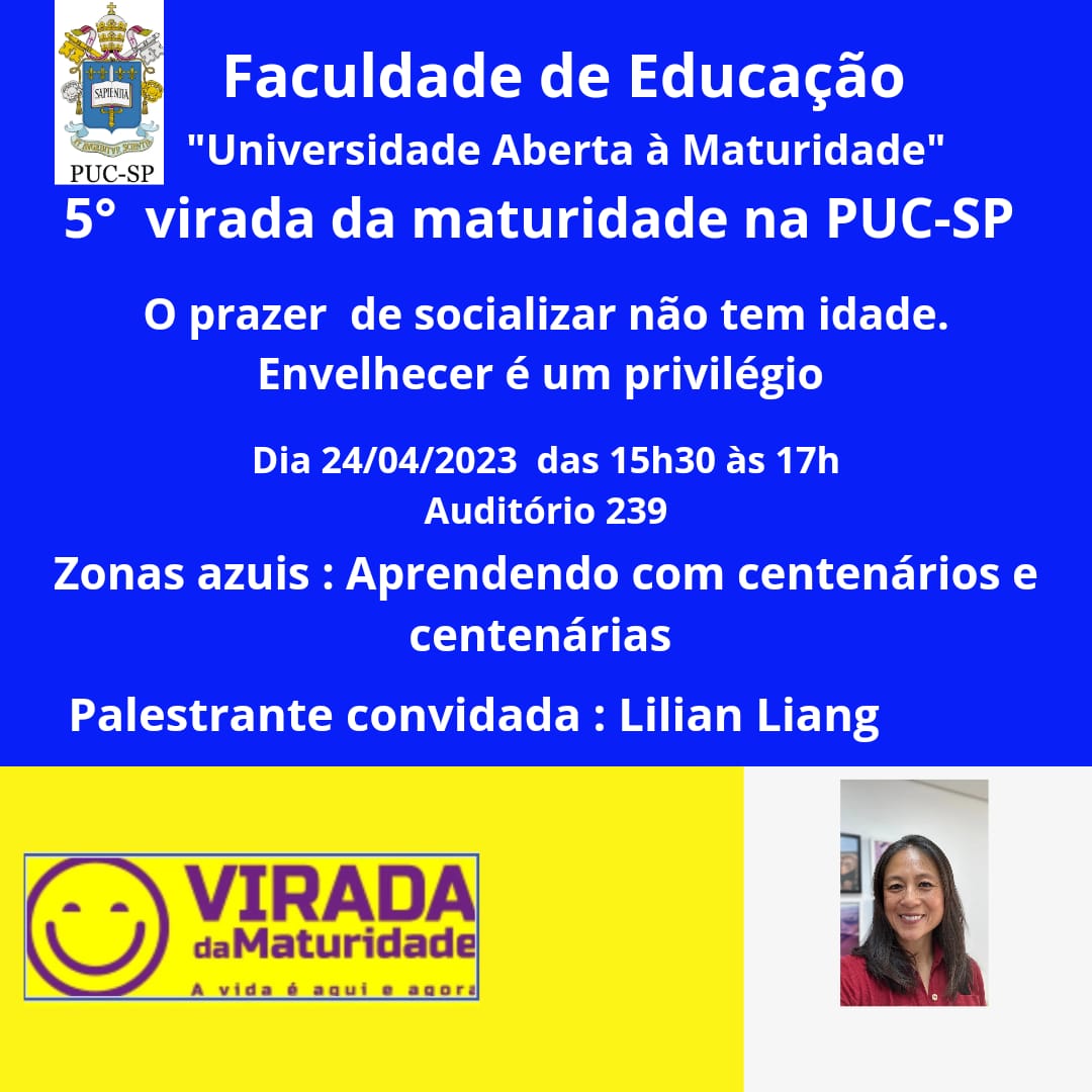 No dia 24/4, às 15/30, a VIrada da Maturidade promove uma ação na PUC-SP, através da Universidade Aberta à Maturidade (UAM)/Faculdade de Educação da PUC-SPuma das parceiras do evento, .