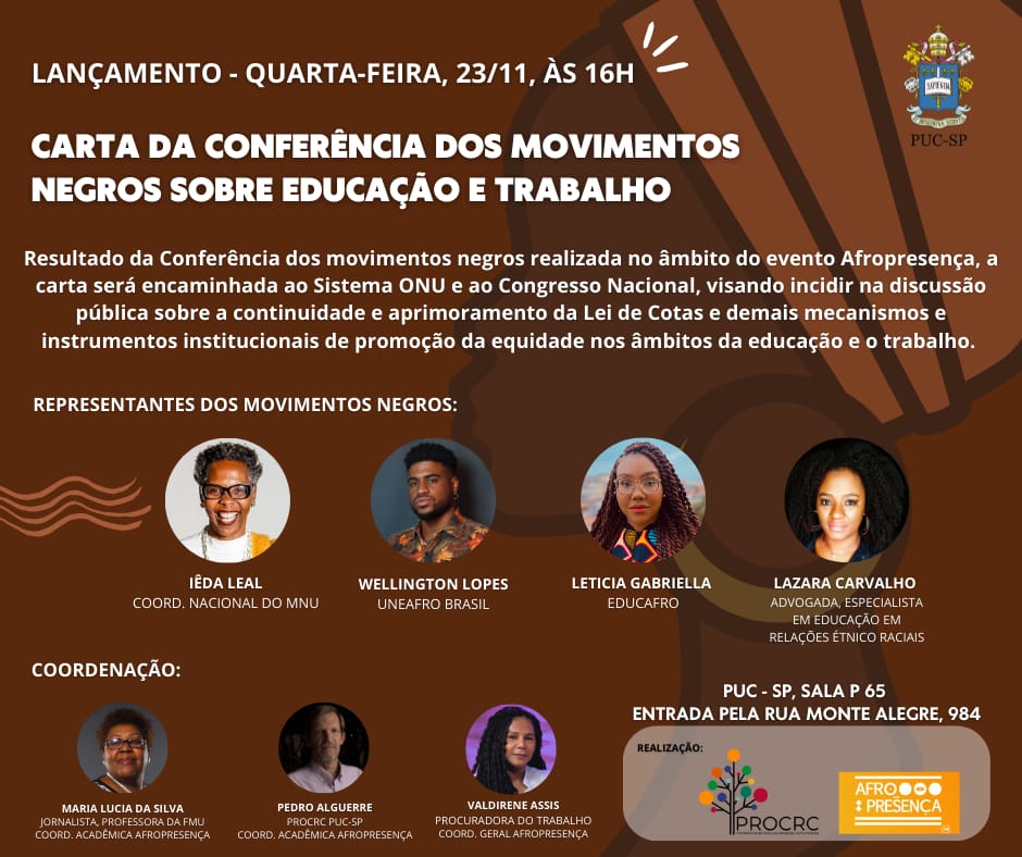 O Afropresença é uma iniciativa do MPT – Ministério Público do Trabalho (https://afropresenca.com.br/) , que realiza o evento com a colaboração de coordenações acadêmica, que a PUC-SP integra, dos movimentos negros, das empresas de RH e dos organismos internacionais. A coordenação dos Movimentos Negros do Afropresença reúne MNU, Uneafro, Unegro, Educafro e Geledés.