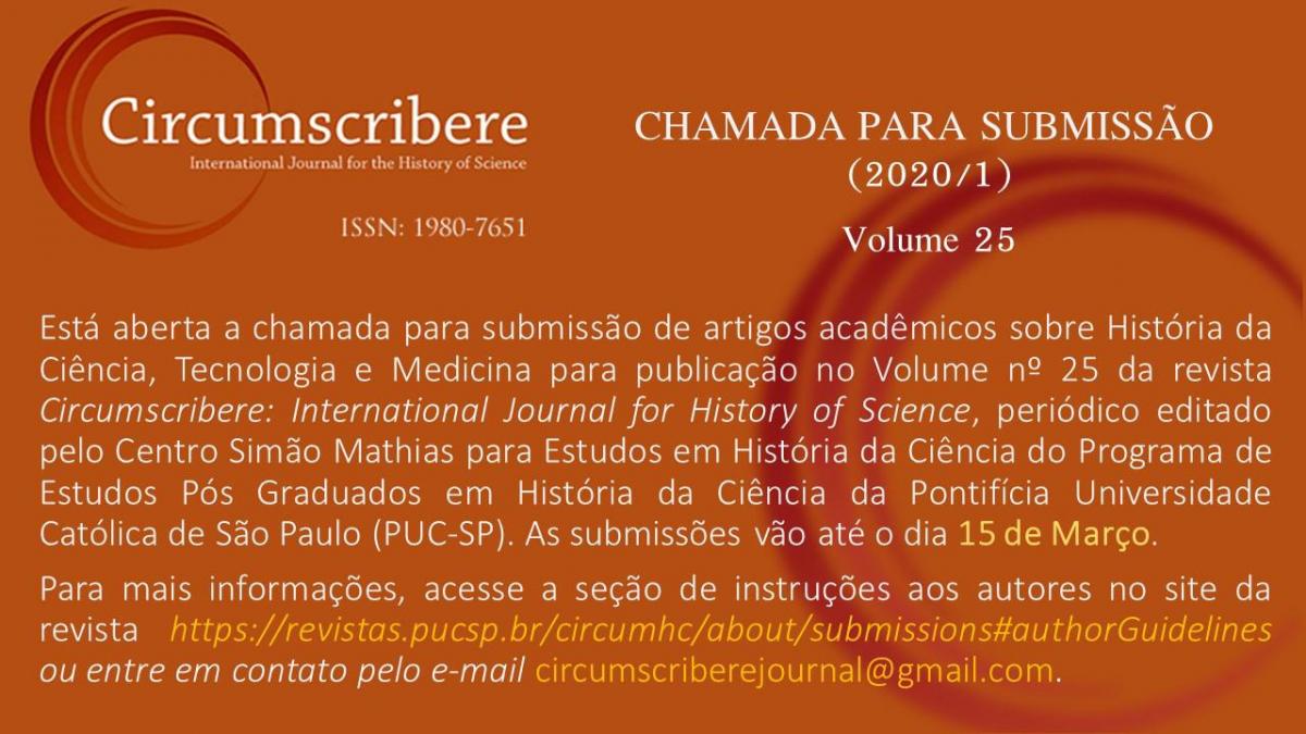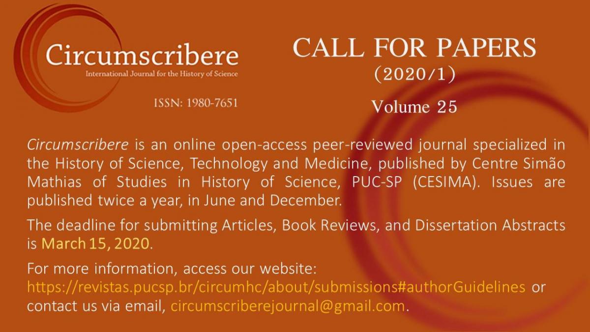 Até 15/03/2020, é possível enviar artigos para a revista Circumscribere (International Journal for the History of Science), nº 25. A publicação eletrônica é um periódico internacional online revisado por pares, editado pelo Centro Simão Mathias para Estudos em História da Ciência. Clique aqui para conhecer as normas para publicação.