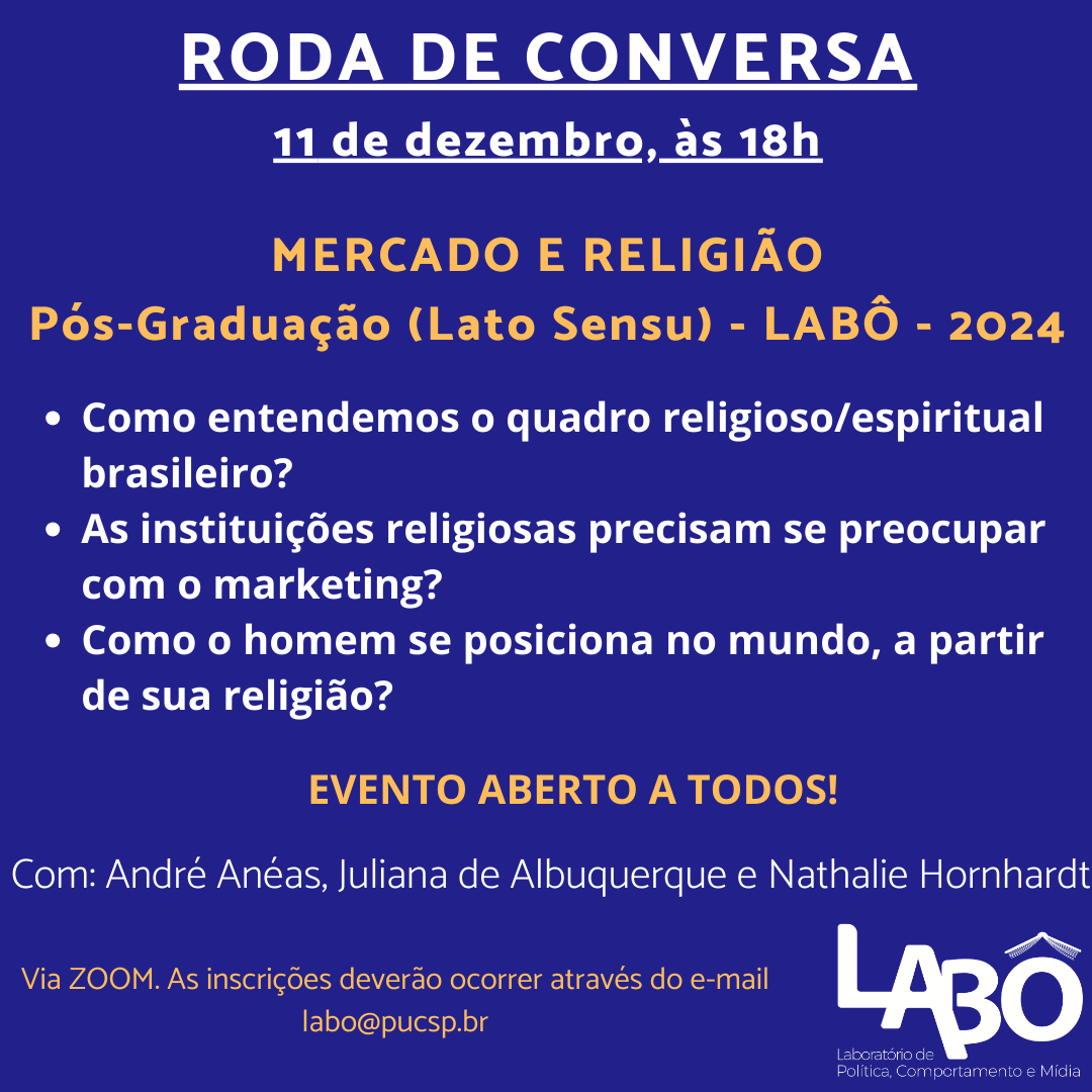A temática da roda de conversa será Mercado e Religião e contará com os professores da Pós-Graduação Latu Sensu do Labô, André Enéas, Juliana de Albuquerque e Nathalie Hornhardt.