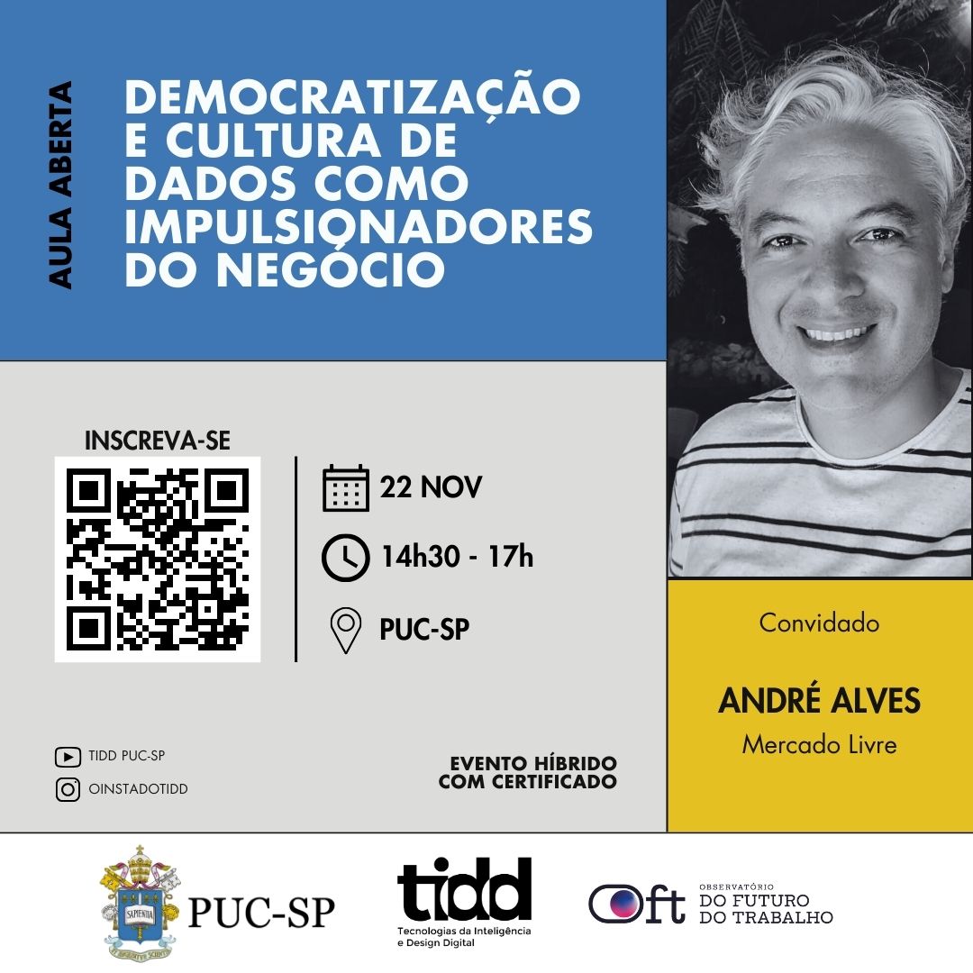 A Coordenação do TIDD convida para a aula aberta ao público sobre o tema "Democratização e Cultura de Dados como impulsionadores do Negócio". O evento contará com a participação de André Alves, gerente de Cultura de Dados no Mercado Livre.
