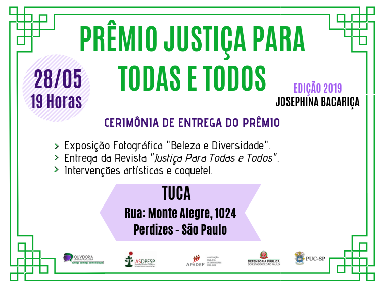 A PUC-SP recebe na noite de 28/5 o Prêmio Justiça para Todas e Todos – Josephina Bacariça 2019, evento anual da Defensoria Pública. A atividade acontece no Tuca (rua Monte Alegre, 1.024), das 18 às 23h.