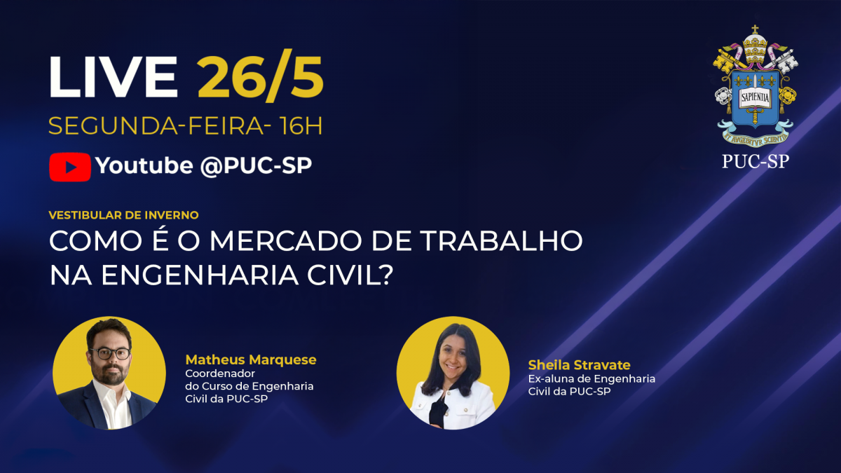 A graduação em Engenharia Civil da continuidade a série de lives que irão abordar o mercado de trabalho dos cursos do Vestibular de Inverno da PUC-SP.