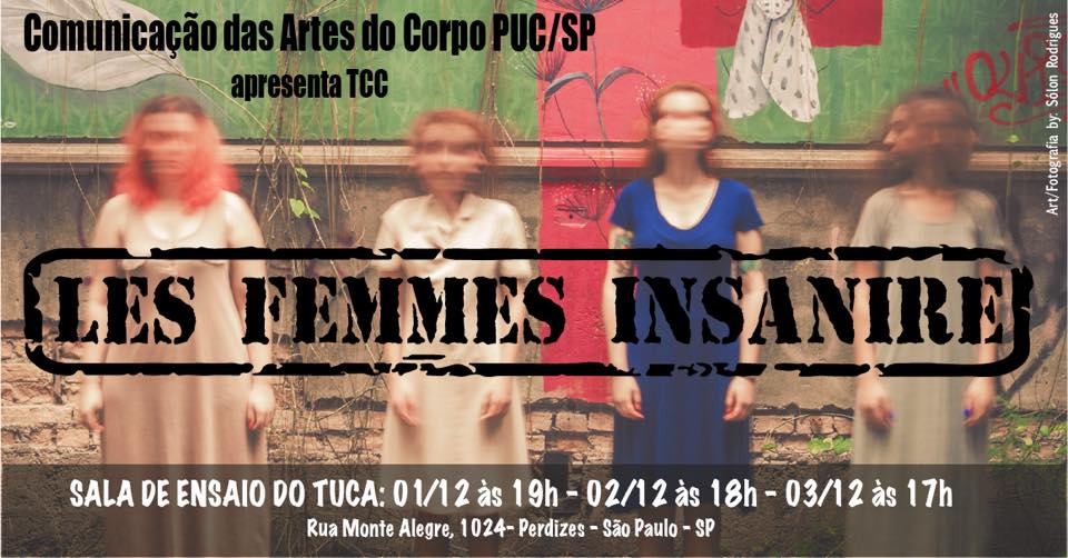 Les Femmes Insanire, trabalho de conclusão de curso da graduação em Comunicação das Artes do Corpo, será apresentado na sala de ensaio do Tuca, dias 1/12, às 19h; 2/12, às 18h; e 3/12, às 17h. O trabalho será apresentado pelas atrizes Beatriz Torres, Lúcia Machado, Paloma Baleeiro e Katie Carnicelli, sob a orientação da profa. Samira Brandão, e pelos atores Lindolfo Nascimento, Luiz Gonzaga e Thiago Thomazzini. Reservas de ingresso devem ser feitas pelo e-mail katiecarnicelli@gmail.com, com o assunto "Les femmes insanire" e no corpo do texto deixe o nome e o dia que pretende assistir.