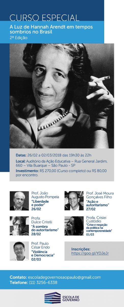 De 26/2 a 2/3, das 19h30 às 22h, será realizada a segunda edição do curso especial A luz de Hannah Arendt em tempos sombrios. A atividade é oferecida pela Escola de Governo e tem a participação da profa. Dulce Critelli (Filosofia). Clique aqui para saber mais.