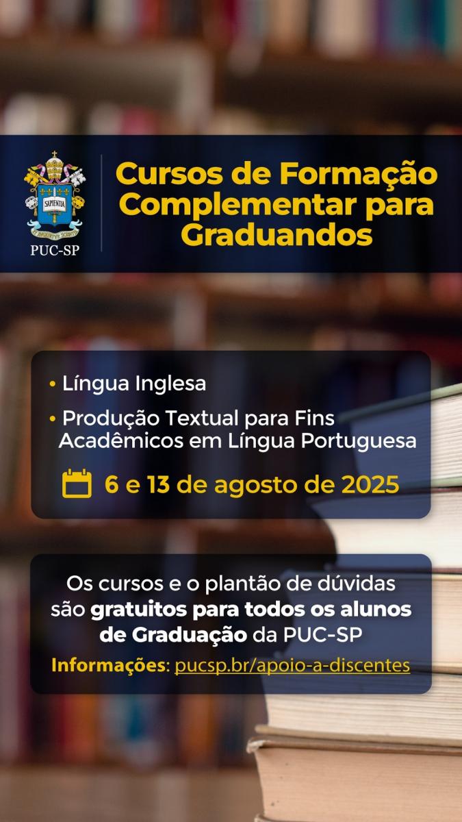 Os cursos serão ofertados, gratuitamente, aos alunos de graduação da PUC-SP devidamente inscritos, desde que preenchidos os requisitos constantes do Edital. Para consultar o documento, clique aqui.