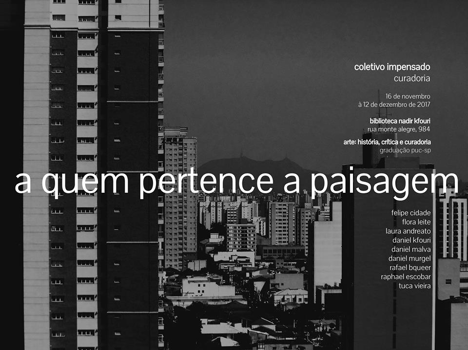 Até 13/12, é possível visitar a exposição “A quem pertence a paisagem”, no hall da biblioteca do campus Monte Alegre. Com projeto curatorial dos alunos de Arte: História, Crítica e Curadoria, a mostra tem orientação dos professors Cauê Alves, Marcos Bastos e Sonia Regis.