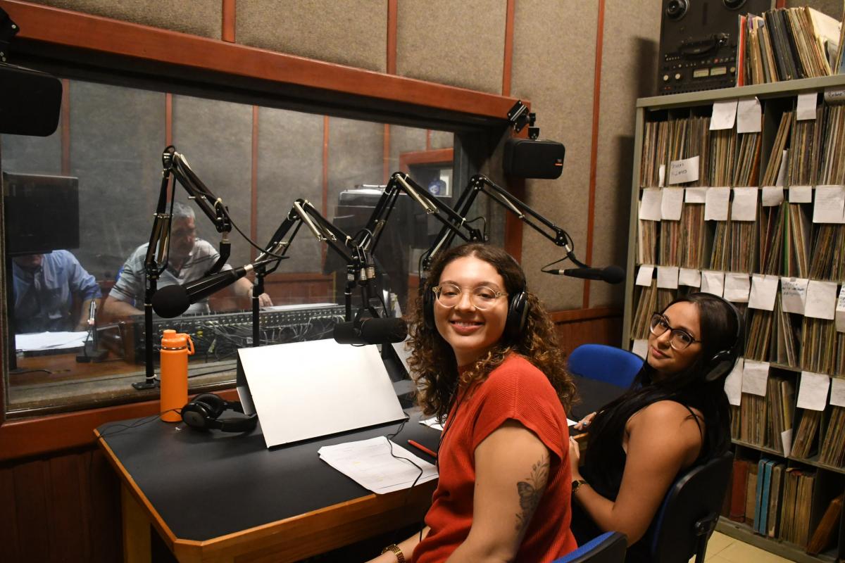 A Fundação São Paulo, mantenedora da PUC-SP, fechou parceria com a rádio CBN para que os estudantes dos cursos de Comunicação participem do programa. O trabalho consiste em produzir uma matéria jornalística totalmente preparada pelos estudantes para ir ao ar na rádio uma vez por mês. Na foto, as estudantes Beatriz Barboza e Giuliana Barrio Zanin gravam programa no estúdio de rádio.