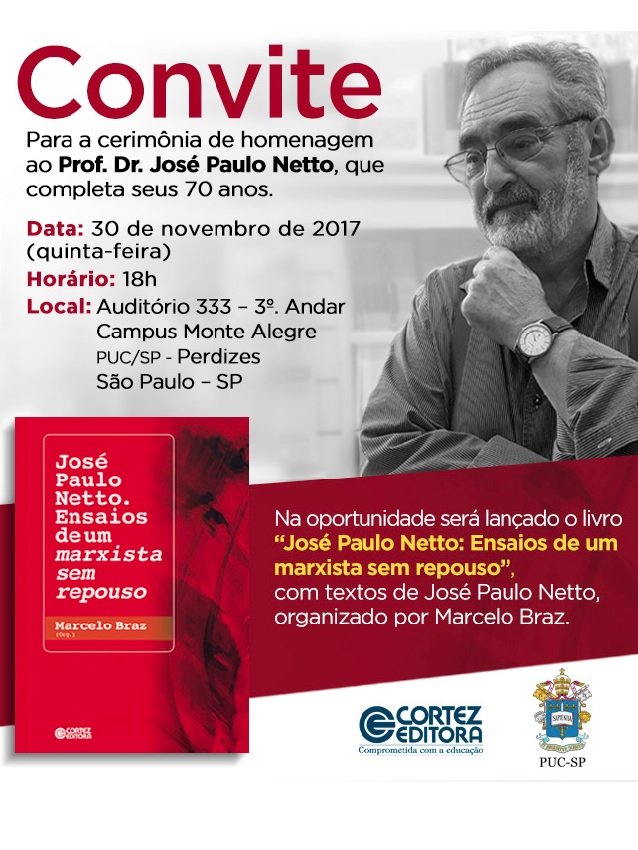 Dia 30/11, às 18h, será realizada homenagem dos 70 anos do prof. José Paulo Netto, seguida de lançamento do livro José Paulo Netto: ensaios de um marxista em repouso (ed. Cortez), organizado por Marcelo Braz. O evento ocorre no campus Monte Alegre, auditório 333 (3º andar, prédio novo).