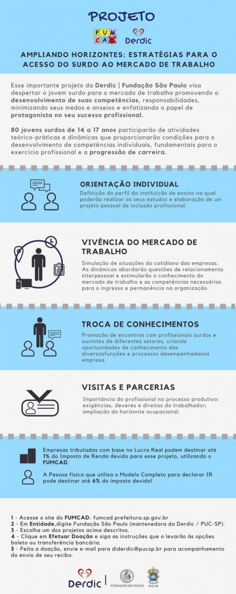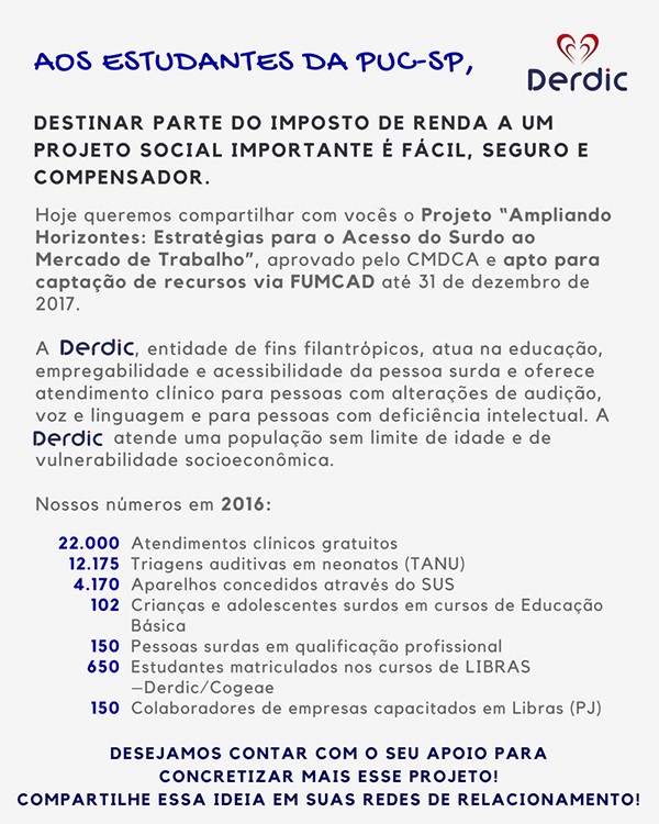 Você sabia que seu Imposto de Renda ou de sua empresa pode ajudar o projeto Ampliando horizontes: estratégias para o acesso do surdo ao mercado de trabalho, da Divisão de Educação e Reabilitação dos Distúrbios da Comunicação (Derdic)?