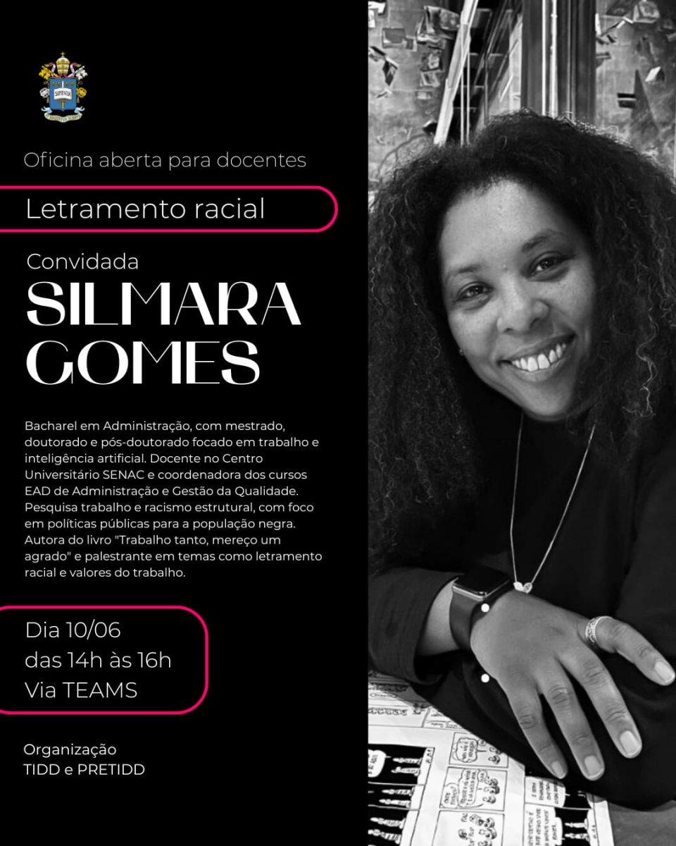 O Pós em Tecnologias da Inteligência e Design Digital (TIDD) e o núcleo afro-acadêmico PRETIDD oferecem a Oficina Aberta para Docentes: Letramento Racial. A atividade será ministrada por Silmara Gomes, pesquisadora do tema trabalho e racismo estrutural, com foco em políticas públicas para a população negra. Clique aqui para participar.