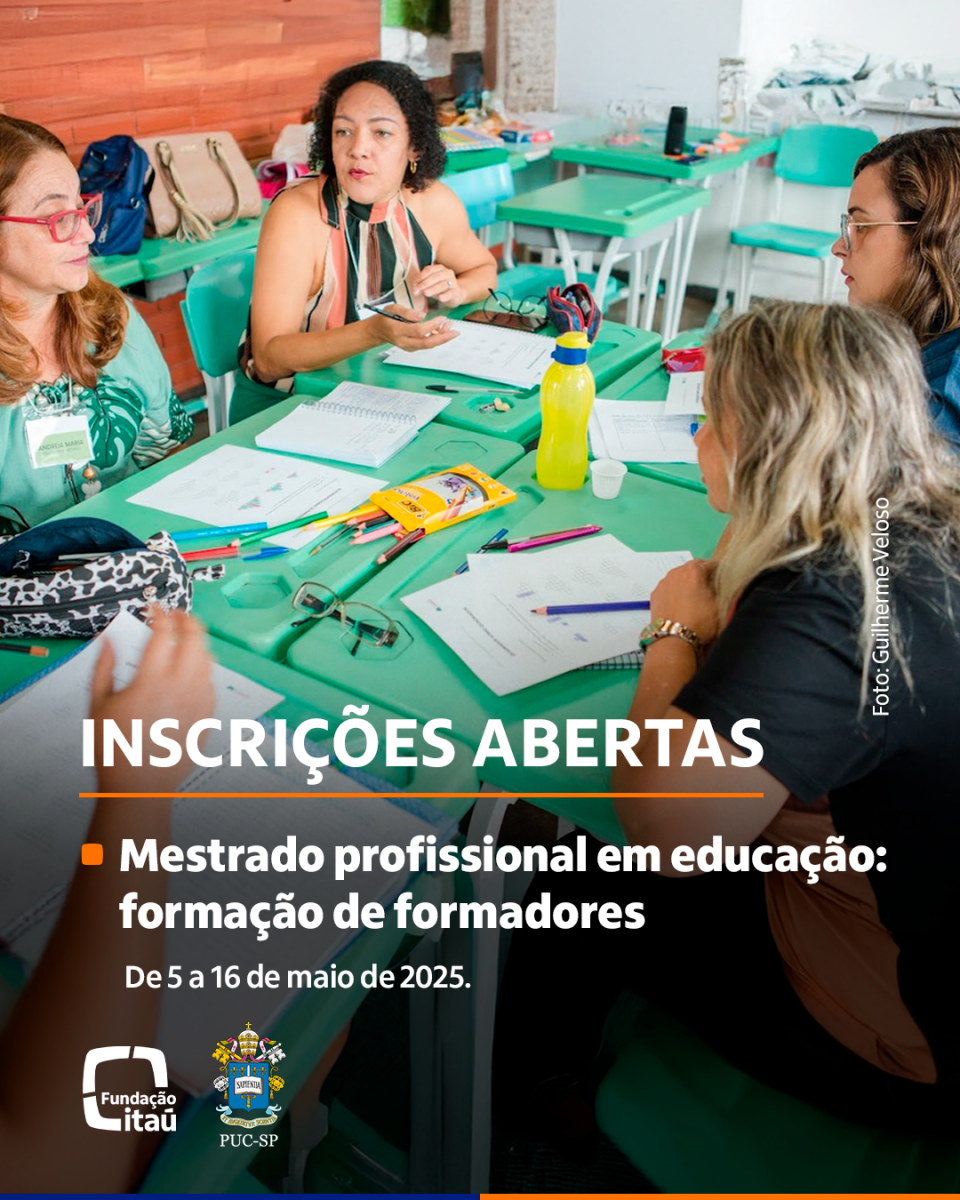 Até 16/5, estão abertas as inscrições para o Mestrado Profissional em Educação: Formação de Formadores, uma parceria da Fundação Itaú e a PUC-SP. O edital pode ser acessado neste link.