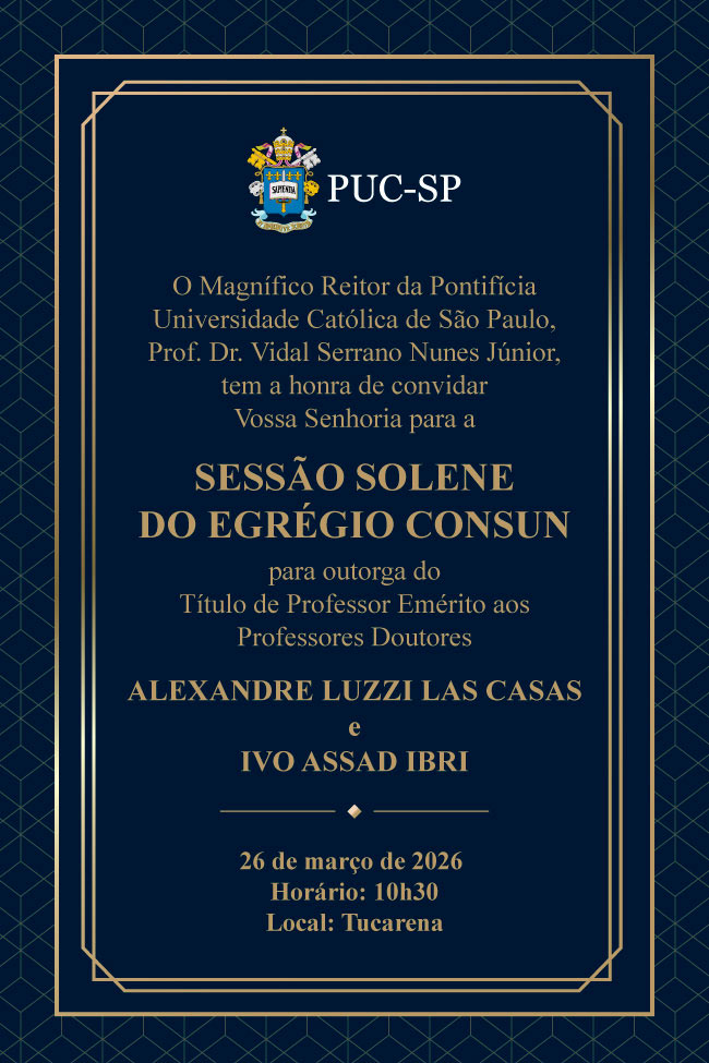 A PUC-SP realizará, no dia 26 de março de 2026, sessão do Conselho Universitário (CONSUN) para a outorga do título de professor emérito aos docentes Alexandre Luzzi Las Casas e Ivo Assad Ibri. A cerimônia será realizada às 10h30, no Tucarena.