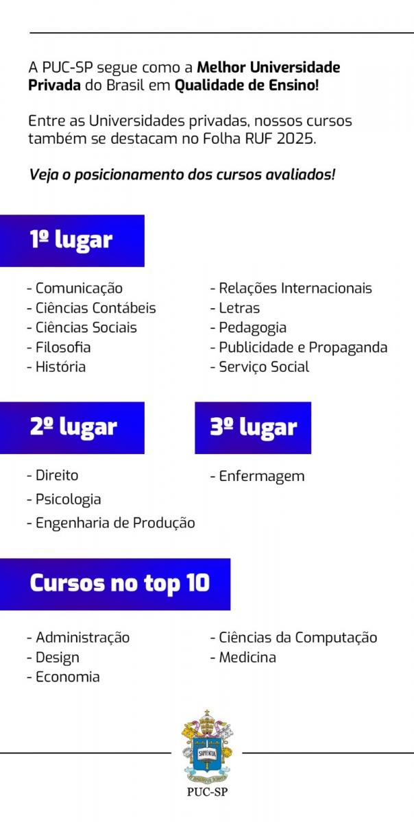 O Ranking Universitário Folha 2025 (RUF), divulgado em novembro, confirmou mais uma vez o destaque da Pontifícia Universidade Católica de São Paulo (PUC-SP) no cenário nacional. A Universidade permanece como a melhor instituição privada do Brasil em Qualidade de