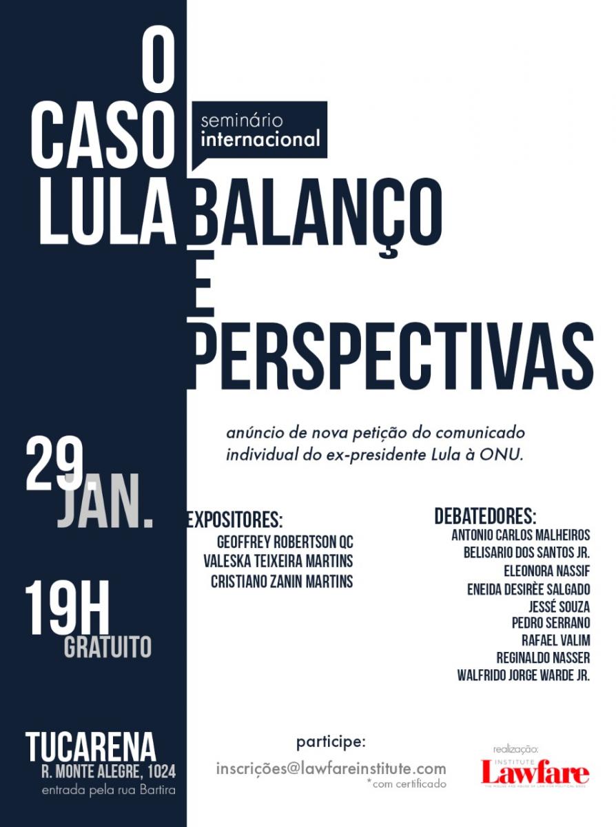 Acontece no Tucarena, dia 29/1, às 19h, o Seminário Internacional "O Caso Lula - Balanço e Perspectivas", anúncio de nova petição do comunicado individual do ex-presidente Lula à ONU. O evento é gratuito e as inscrições devem ser feitas pelo e-mail: inscrições@lawfireinstitute.com.